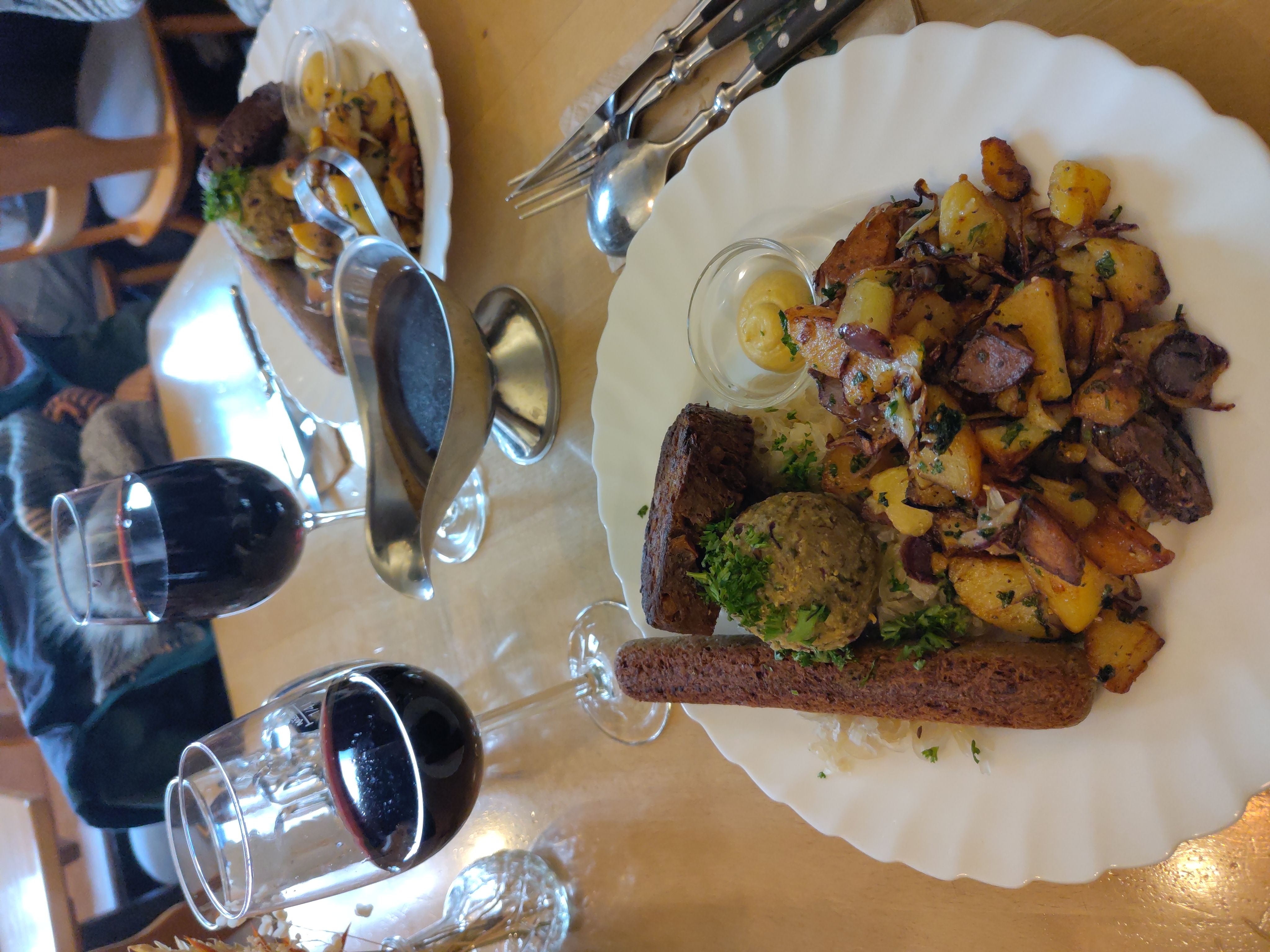 2 Pfälzer Teller (Saumagen, Bratwurst, Leberknodeln) mit Dornfeldersauße, Rieslimgkraut und Bratkartoffeln, mit 2 Gläser Dornfelder deSource data licensing:
